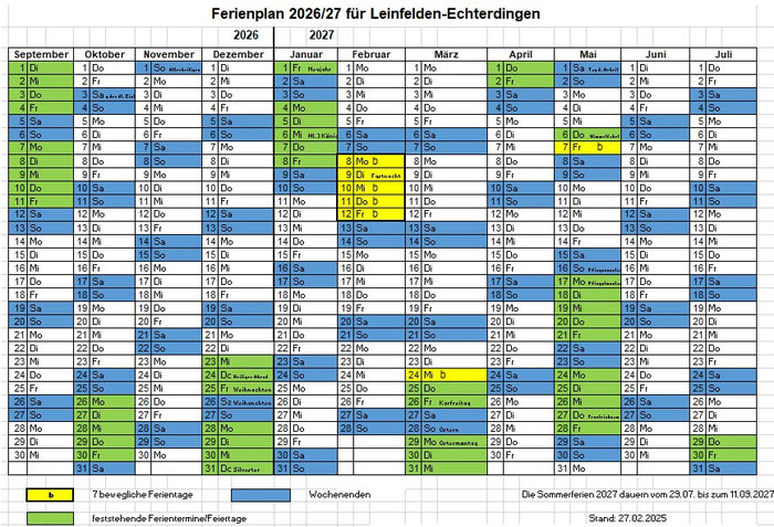 Den Ferienplan mit den beweglichen Ferientagen, der für alle Schulen der Stadt Leinfelden-Echterdingen Gültigkeit hat, finden Sie hier auch zum Download.